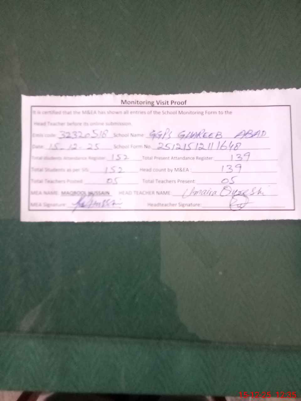 | Attendance Register | Head Teacher | MEA with School | Visit Proof |