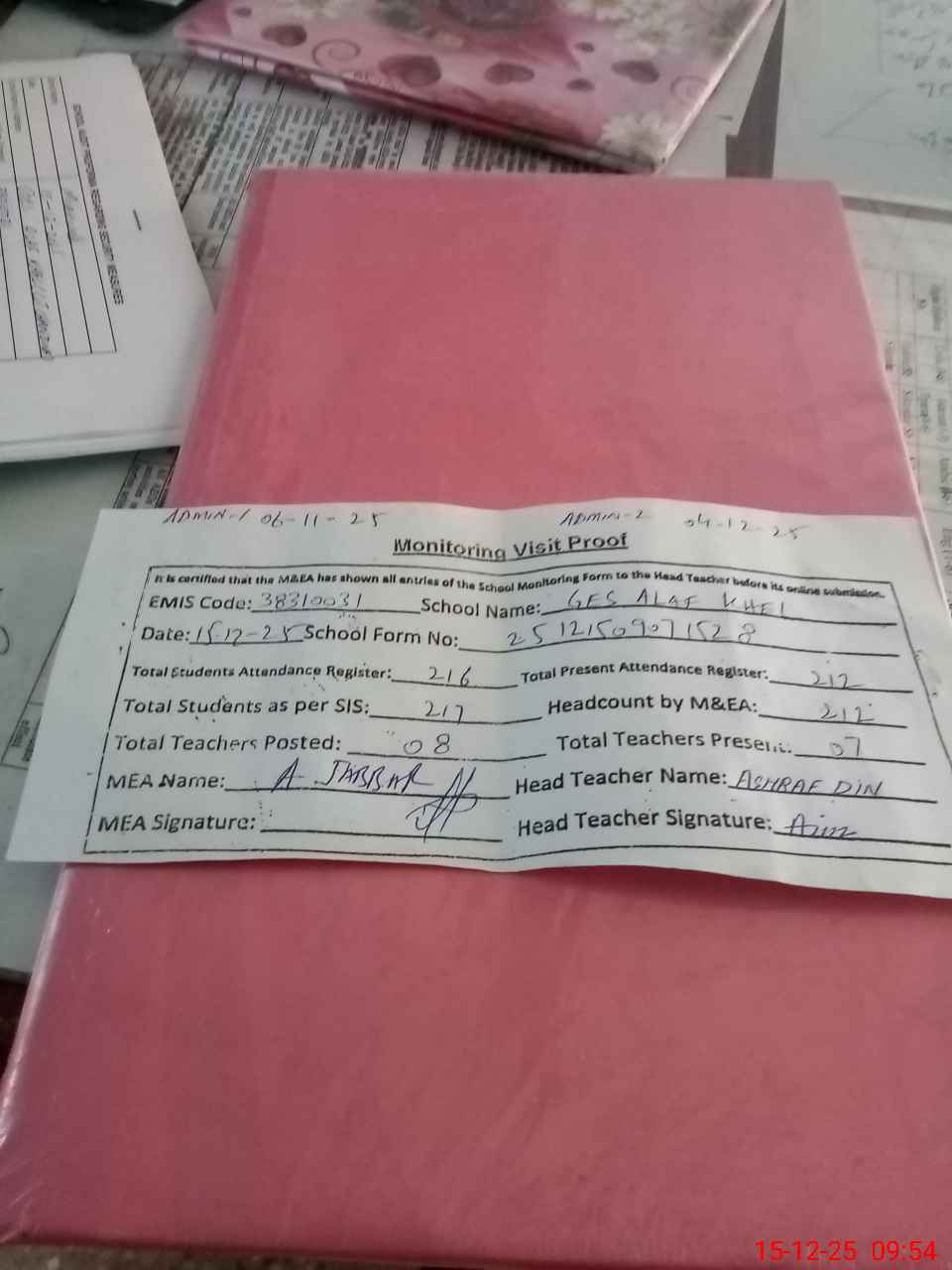 | Attendance Register | Head Teacher | MEA with School | Visit Proof |