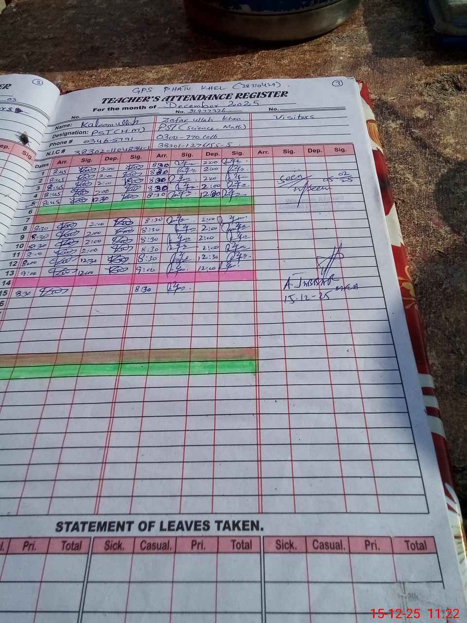 | CNIC | Full Name | Designation | R/C | Absence during last cal. month |