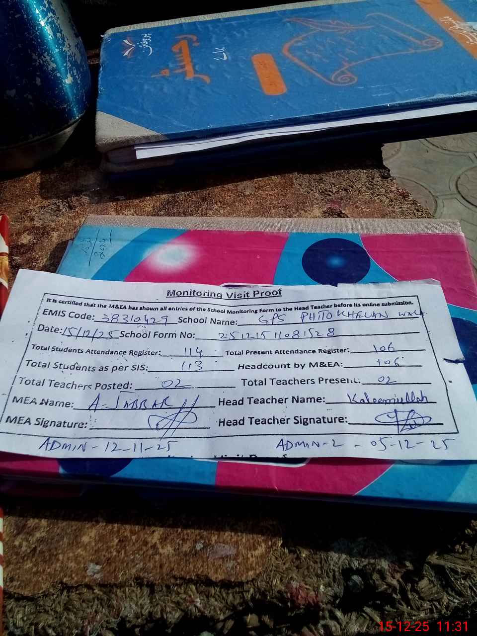 | Attendance Register | Head Teacher | MEA with School | Visit Proof |