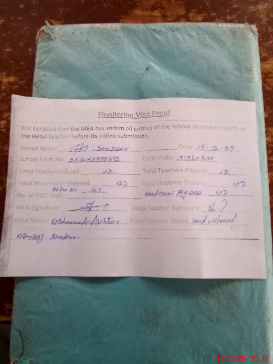 | Attendance Register | Head Teacher | MEA with School | Visit Proof |