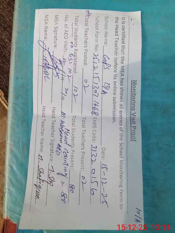 | EMIS Code: 31320156 | Name of School: GPS CHAK NO. 13/A | |||