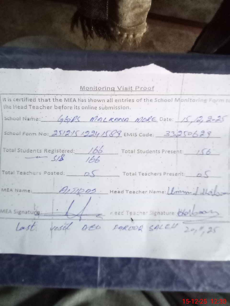 | Attendance Register | Head Teacher | MEA with School | Visit Proof |