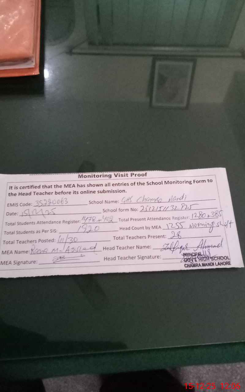 | EMIS Code: 35220036 | Name of School: GHS CHAMRA MANDI LAHORE | |||