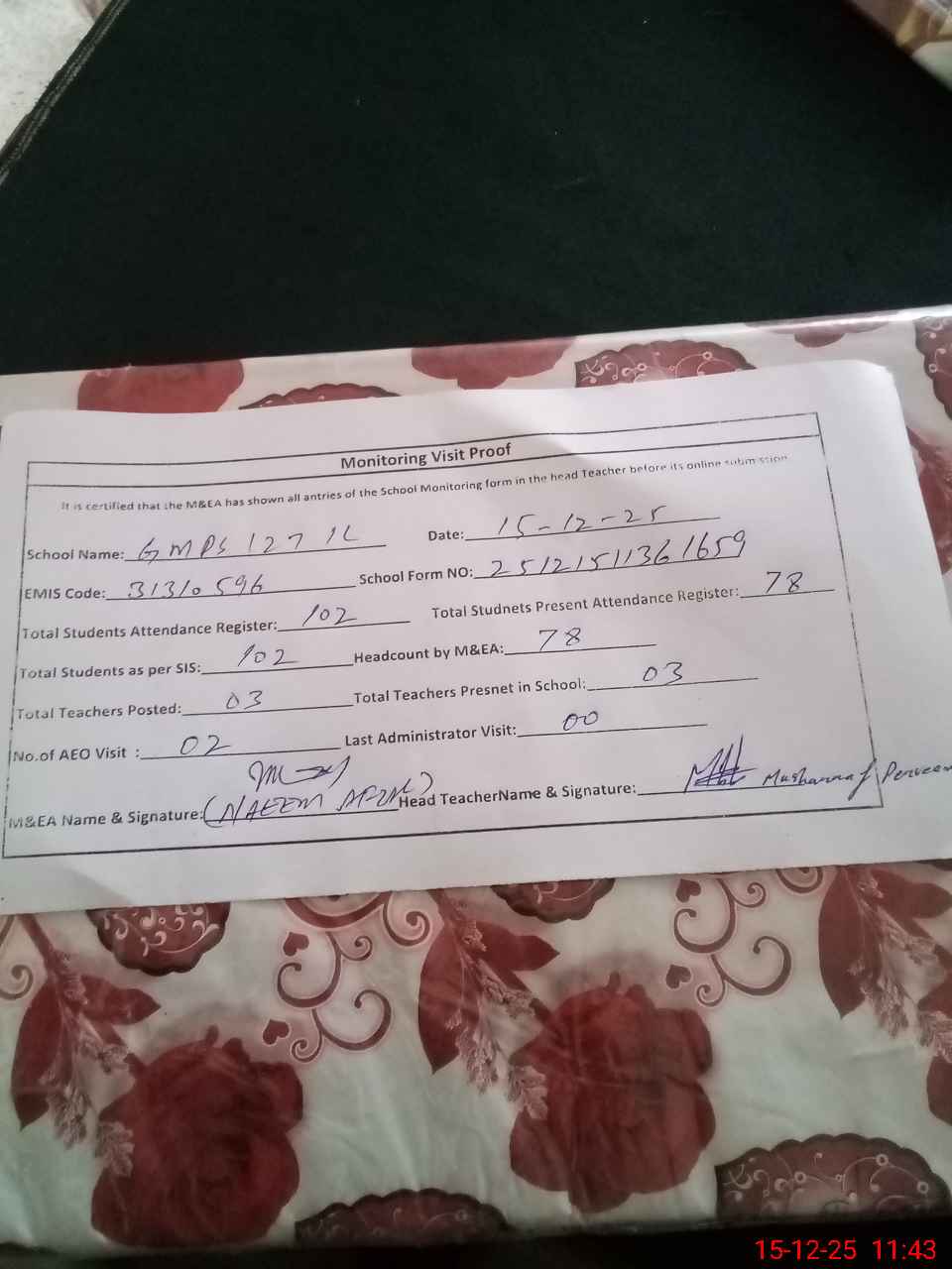 | Attendance Register | Head Teacher | MEA with School | Visit Proof |