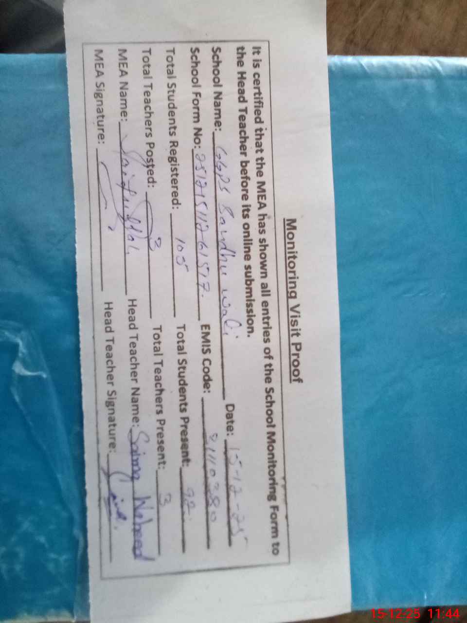 | Attendance Register | Head Teacher | MEA with School | Visit Proof |