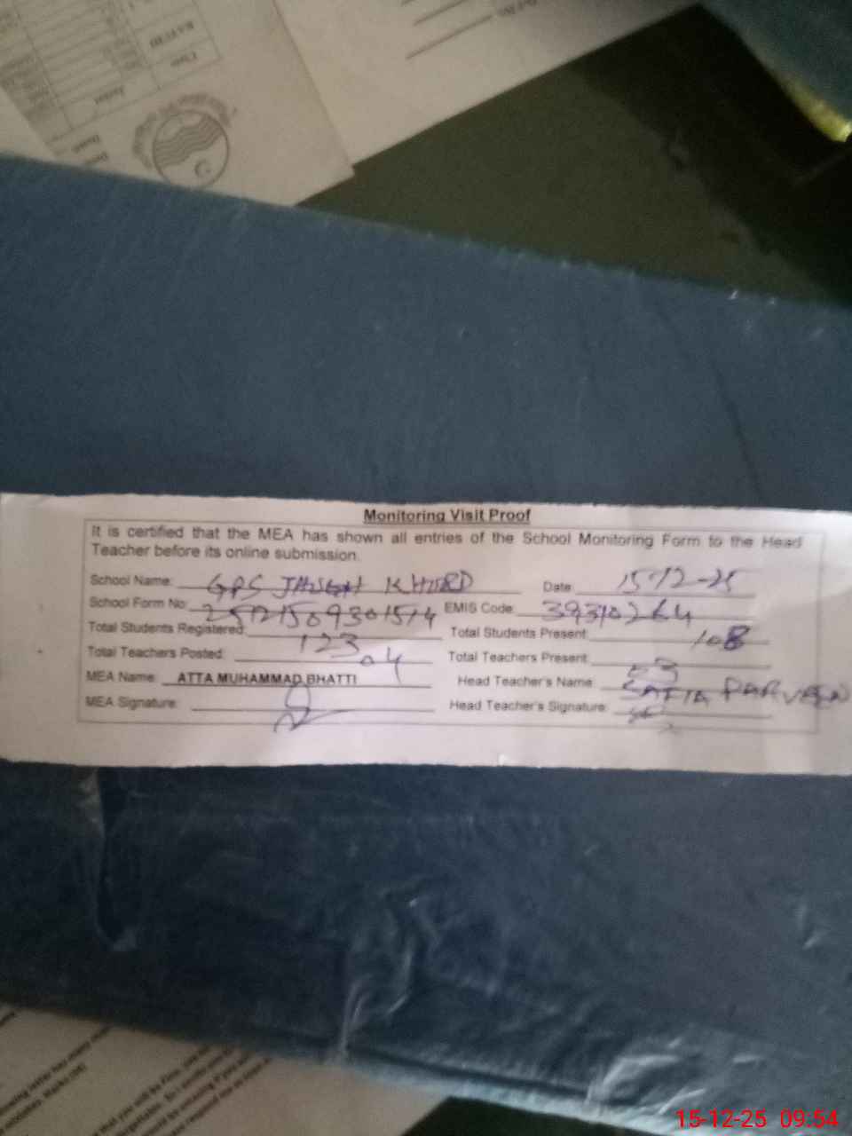 | Attendance Register | Head Teacher | MEA with School | Visit Proof |