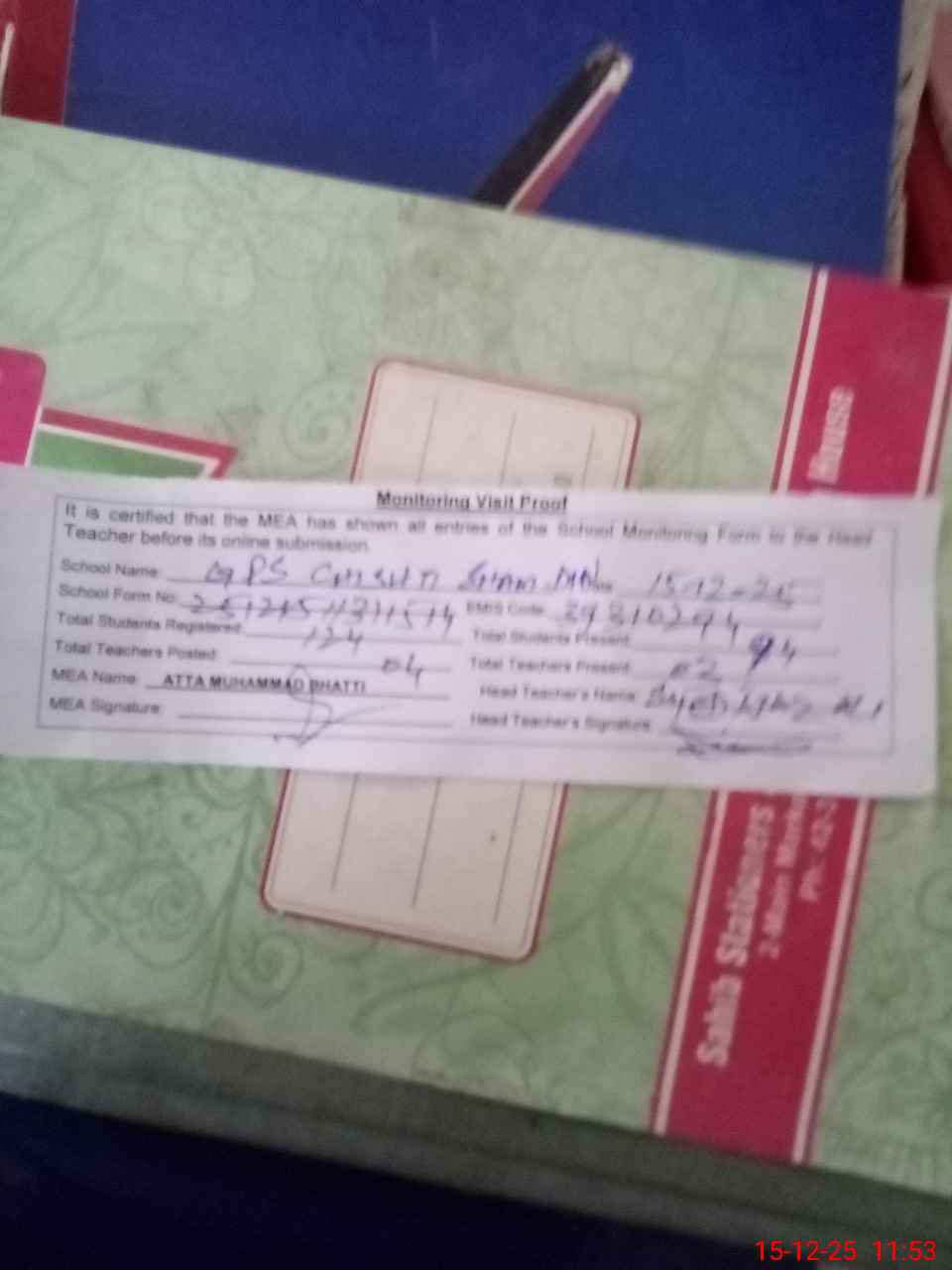 | Attendance Register | Head Teacher | MEA with School | Visit Proof |