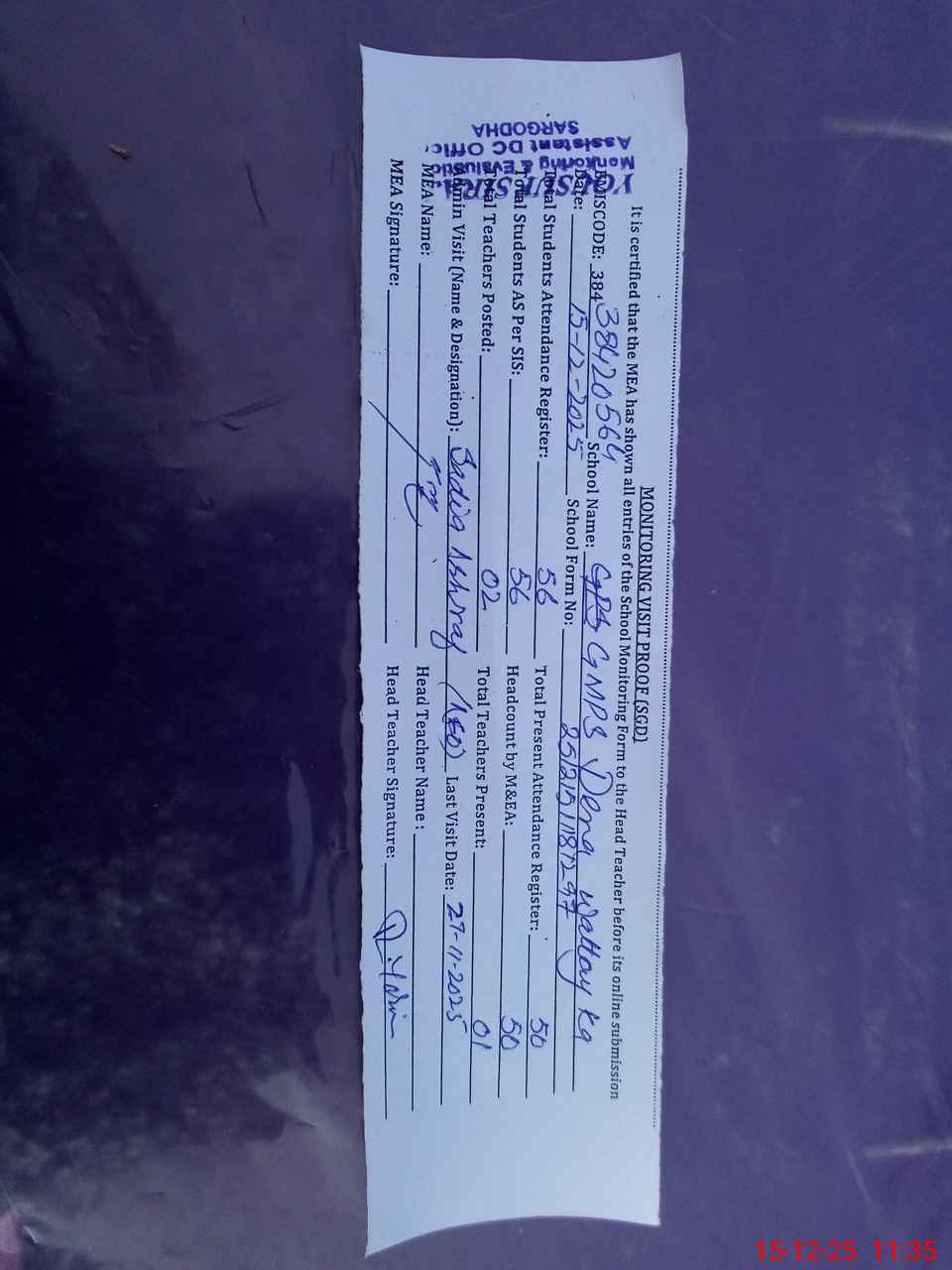 | Attendance Register | Head Teacher | MEA with School | Visit Proof |