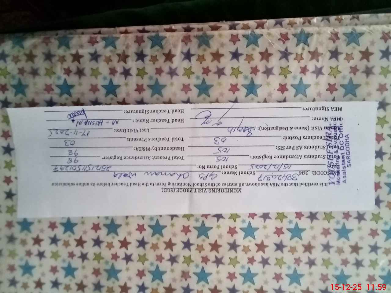 | Name: MU**** HU**** Designation: (School Headmaster's/Headmistress's) PST Phone/Cell Number: 03**** |
