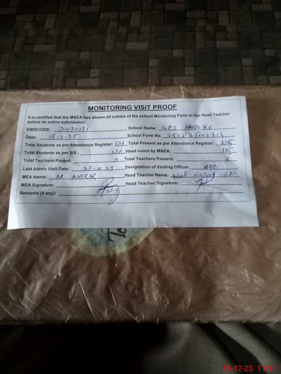 | Attendance Register | Head Teacher | MEA with School | Visit Proof |
