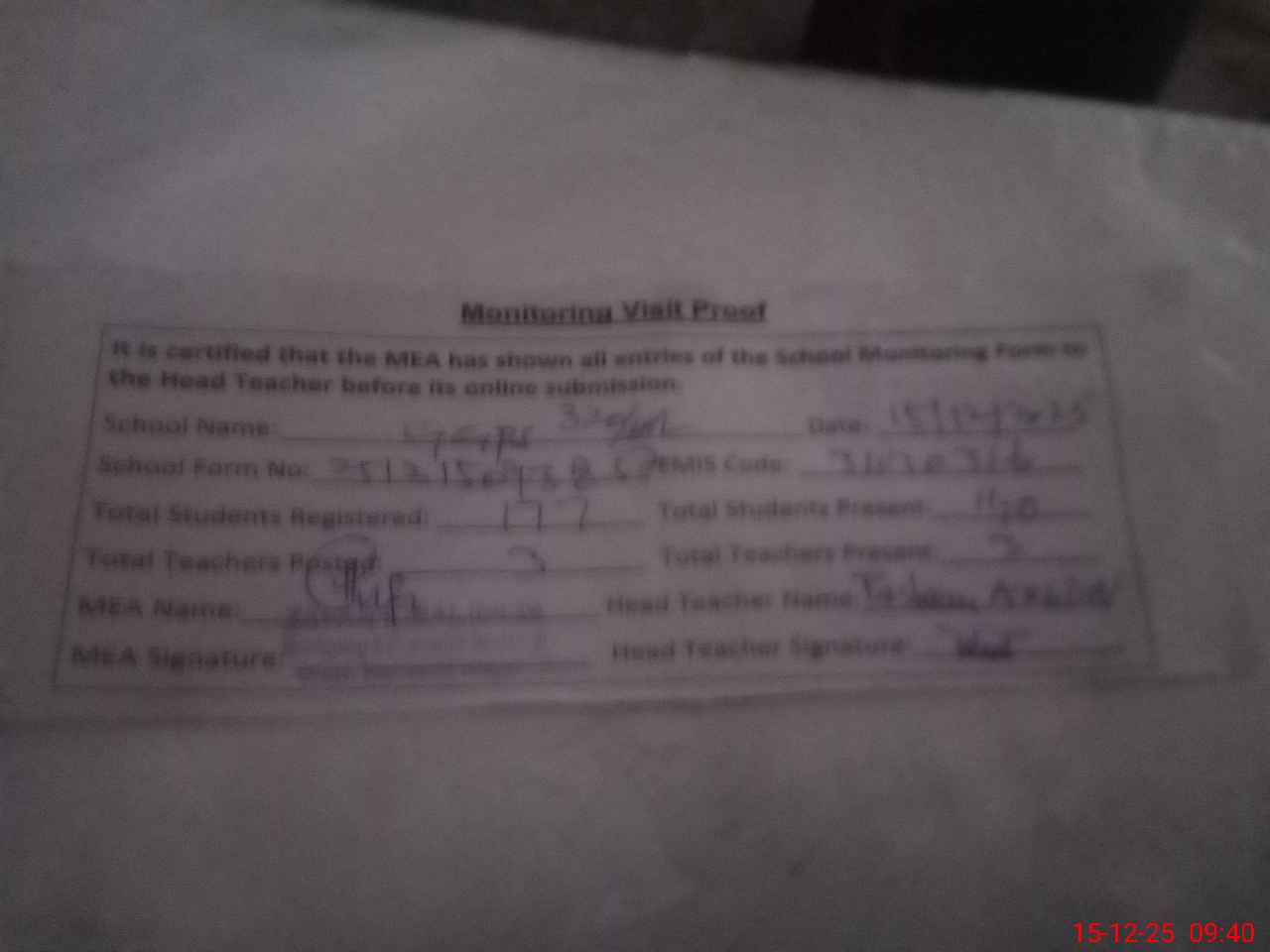| Attendance Register | Head Teacher | MEA with School | Visit Proof |