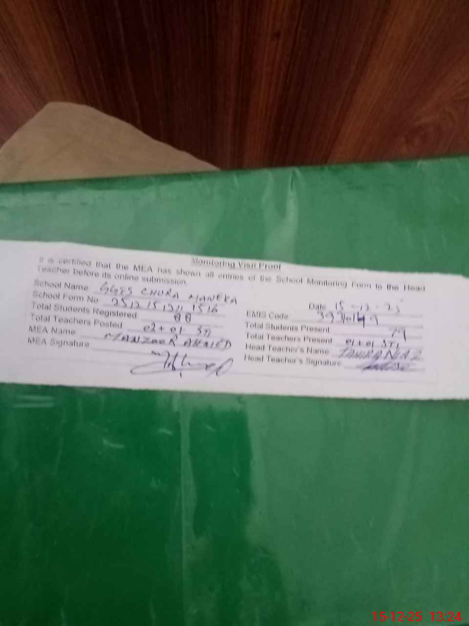 | Attendance Register | Head Teacher | MEA with School | Visit Proof |