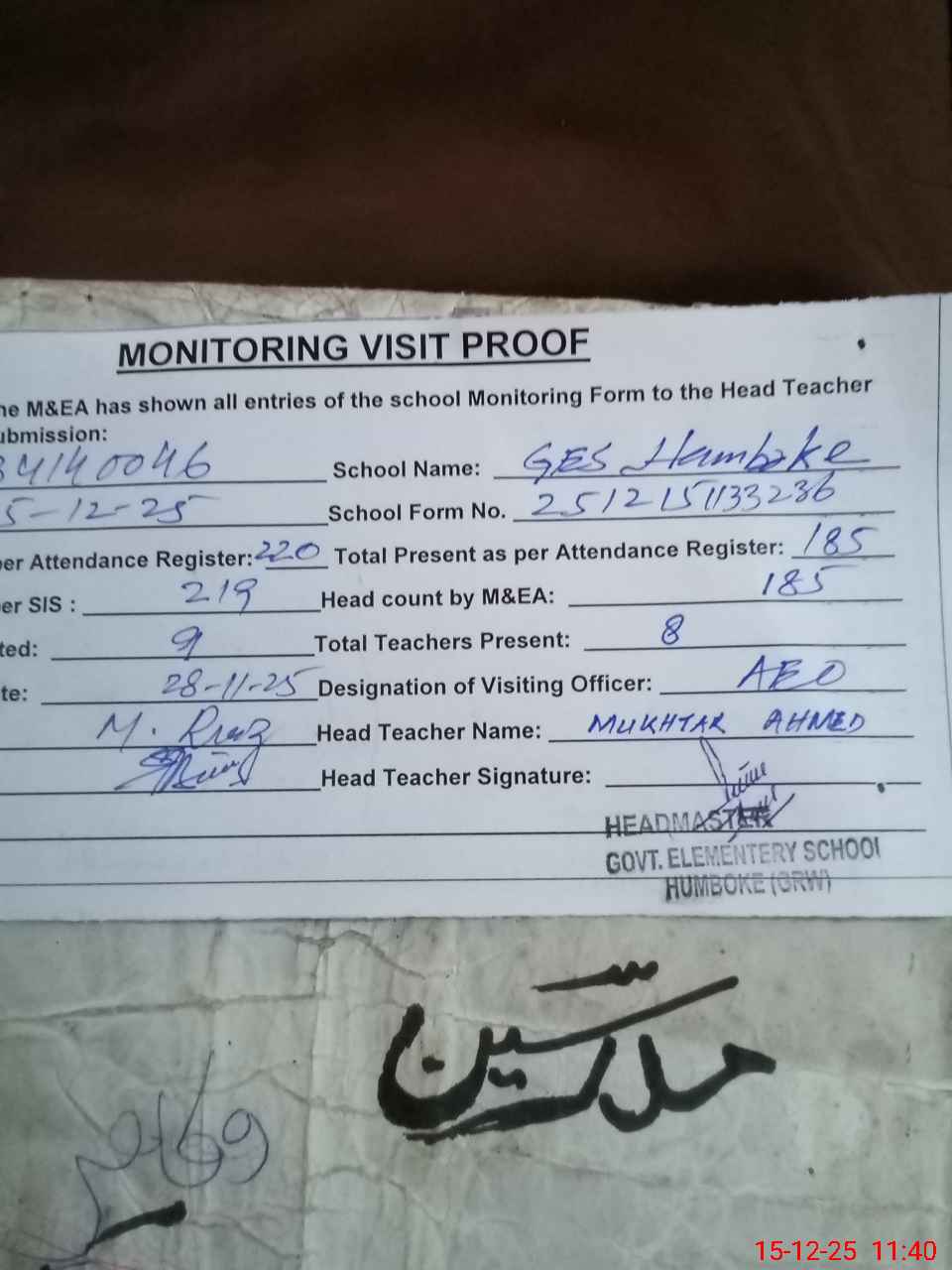 | Attendance Register | Head Teacher | MEA with School | Visit Proof |