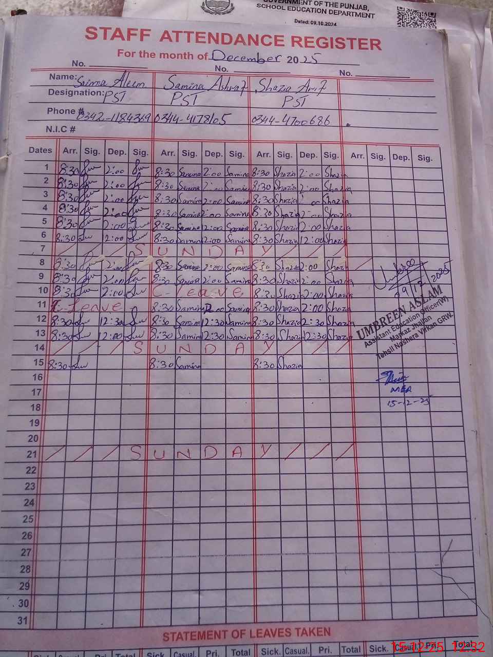 | CNIC | Full Name | Designation | R/C | Absence During Last Calender Month |