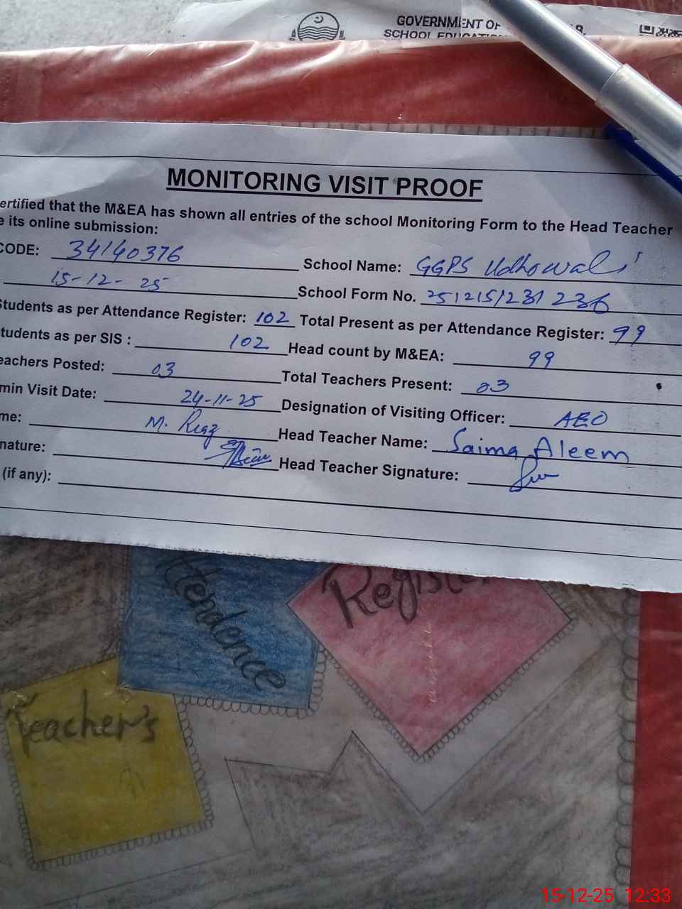 | Attendance Register | Head Teacher | MEA with School | Visit Proof |