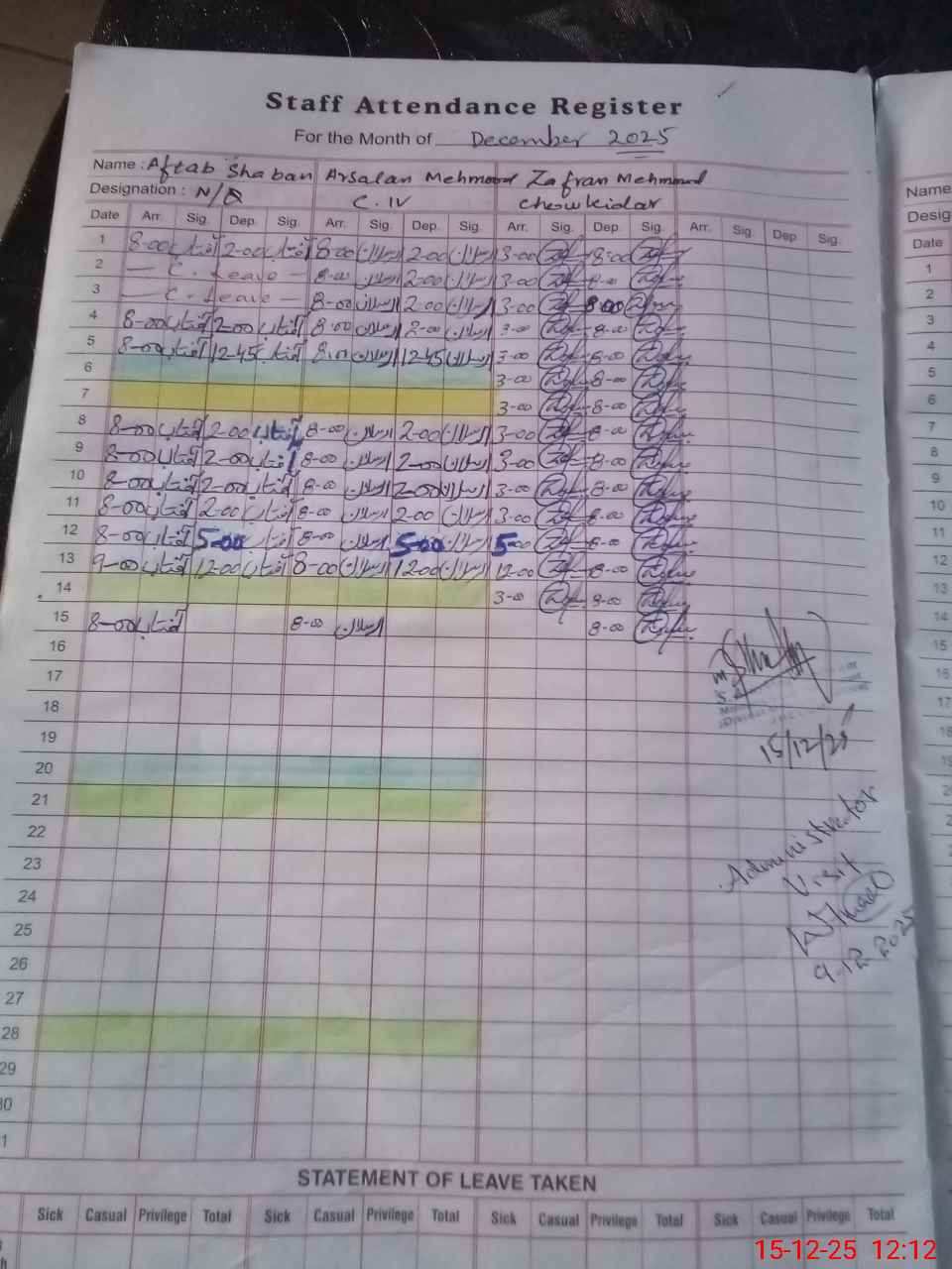 | CNIC | Full Name | Designation | R/C | Absence During Last Calender Month |