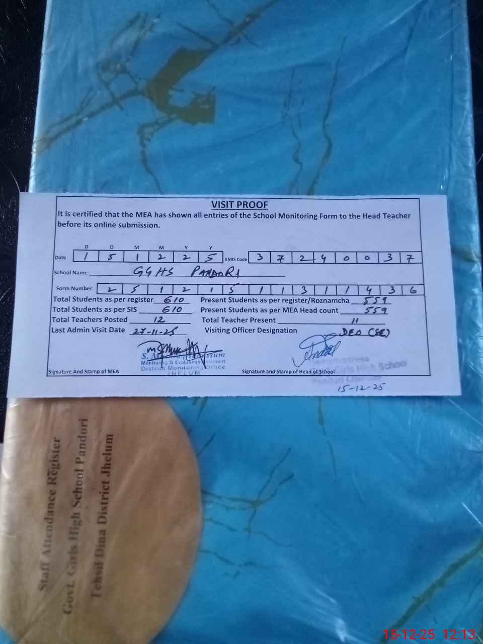 | Attendance Register | Head Teacher | MEA with School | Visit Proof |