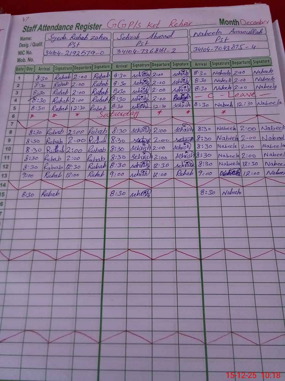 | CNIC | Full Name | Designation | R/C | Absence During Last Calender Month |