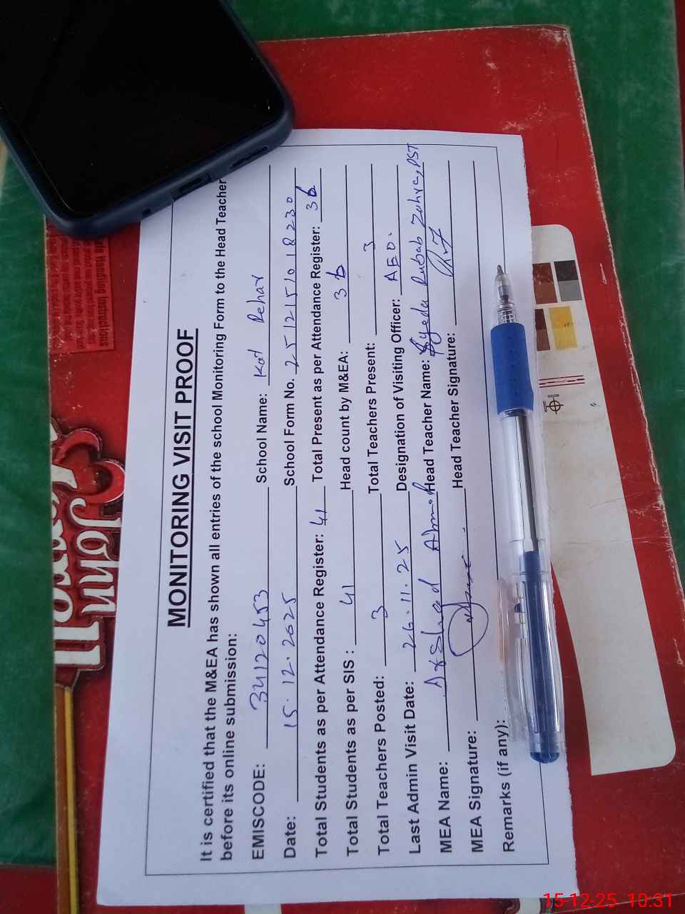 | Attendance Register | Head Teacher | MEA with School | Visit Proof |