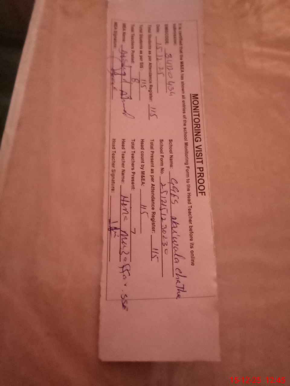 | Attendance Register | Head Teacher | MEA with School | Visit Proof |