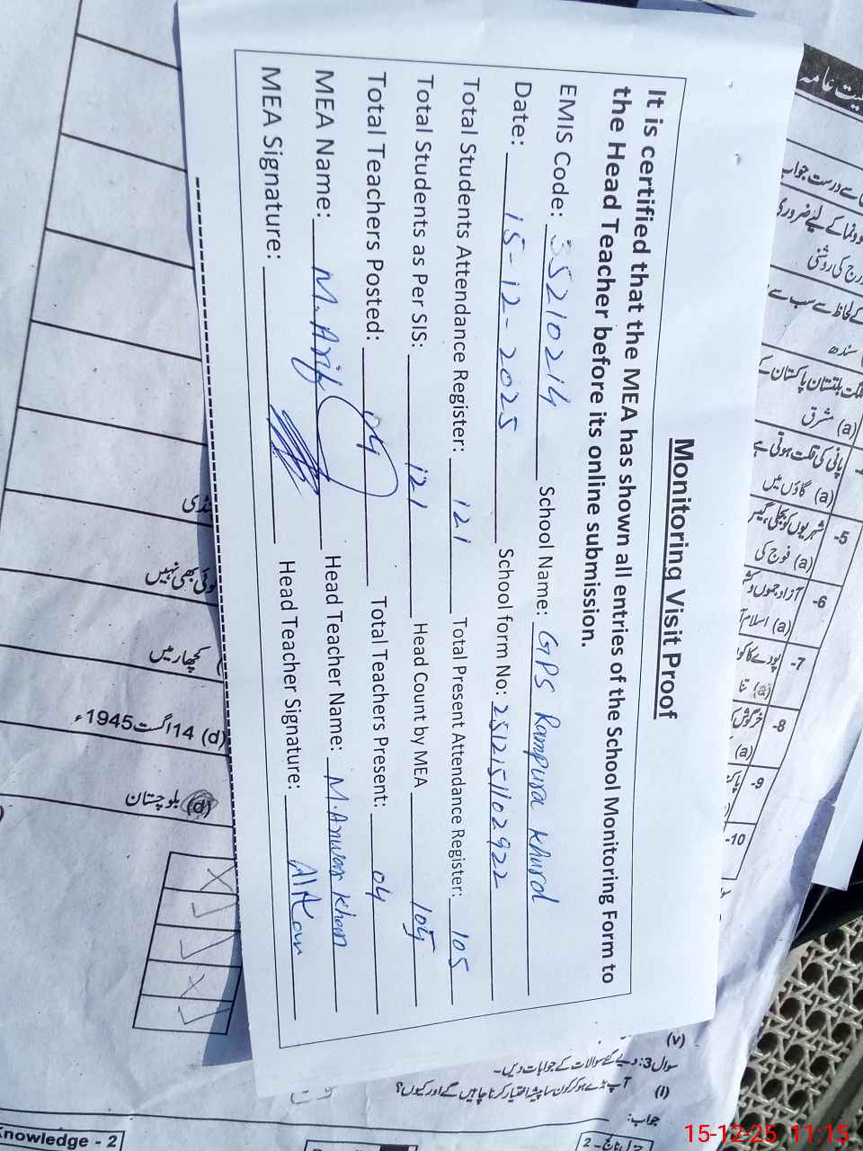 | Attendance Register | Head Teacher | MEA with School | Visit Proof |