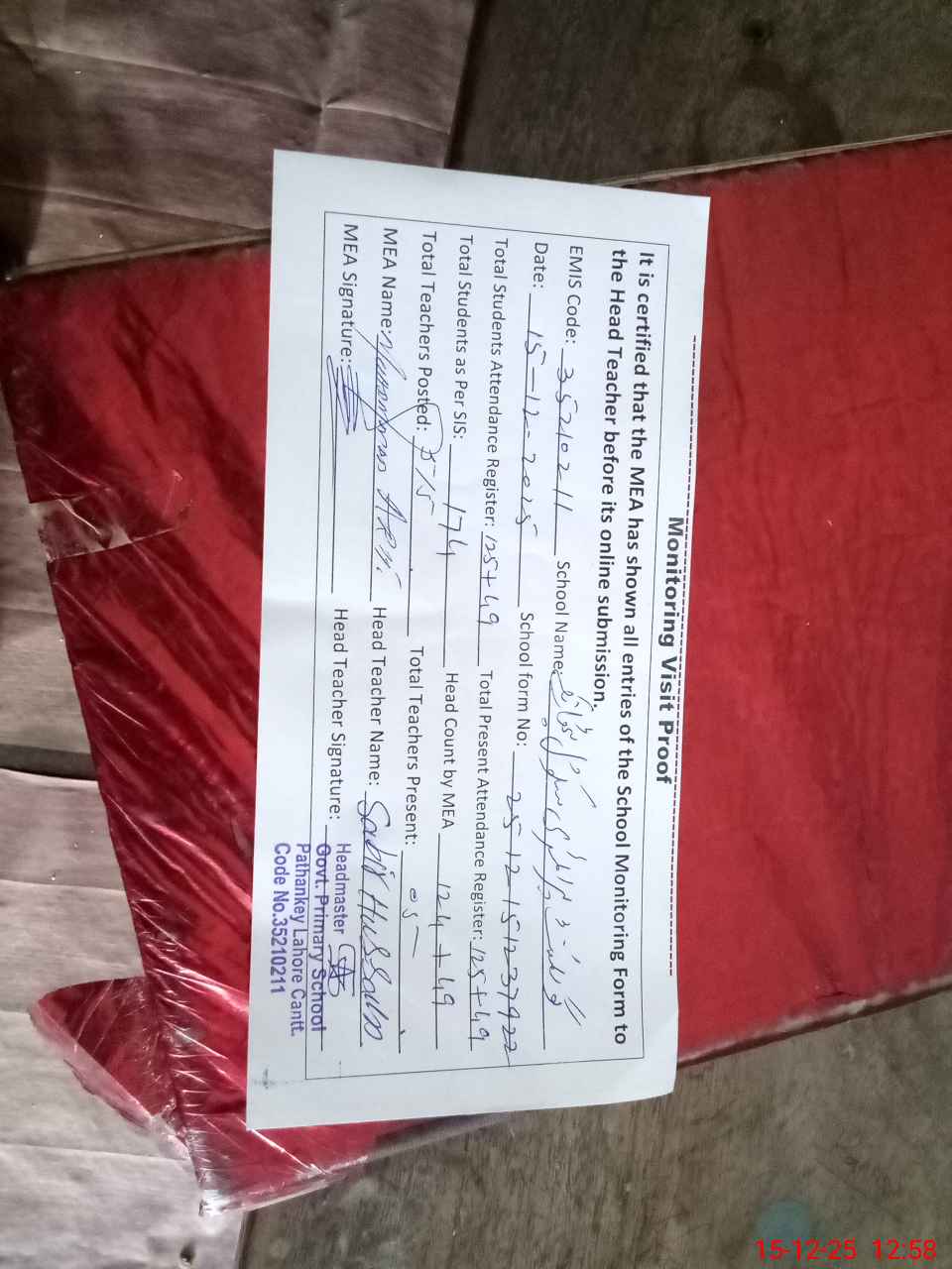 | Attendance Register | Head Teacher | MEA with School | Visit Proof |