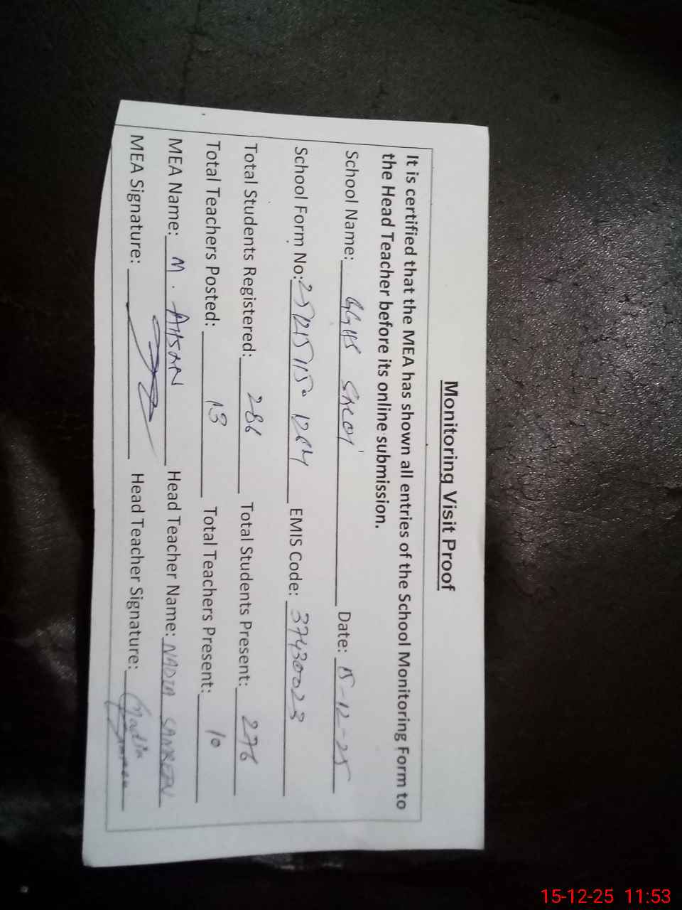 | Attendance Register | Head Teacher | MEA with School | Visit Proof |