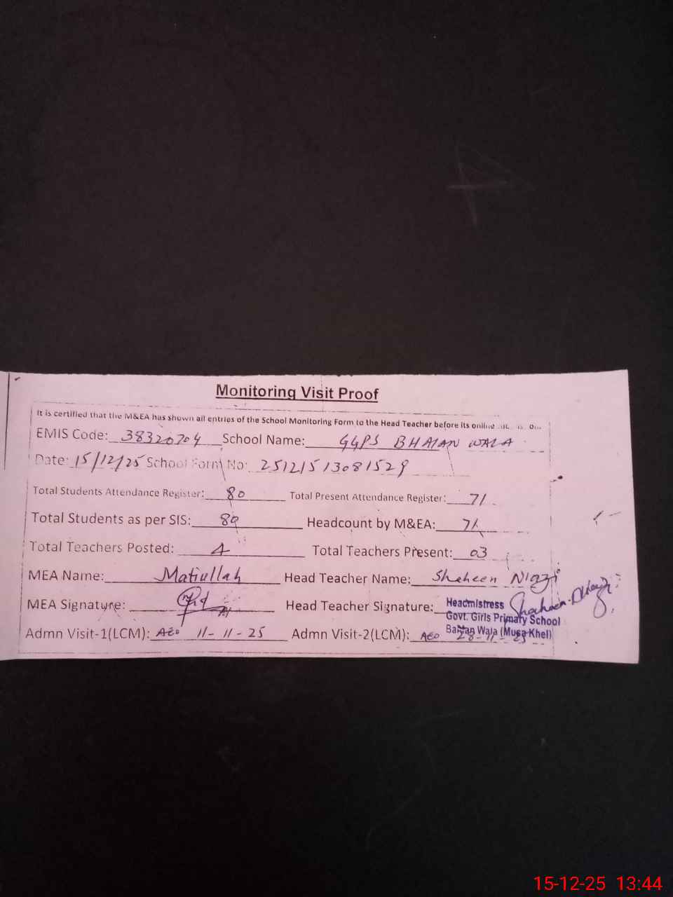 | Attendance Register | Head Teacher | MEA with School | Visit Proof |
