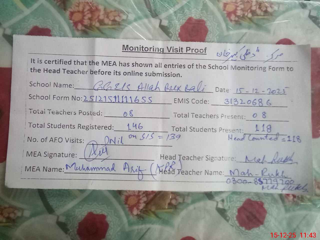 | Attendance Register | Head Teacher | MEA with School | Visit Proof |