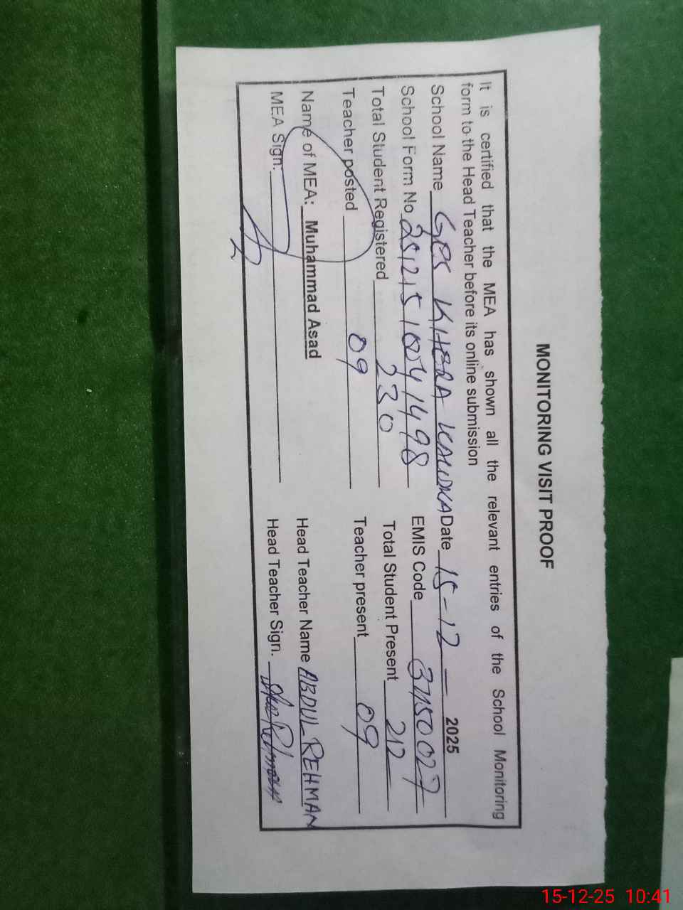 | Attendance Register | Head Teacher | MEA with School | Visit Proof |