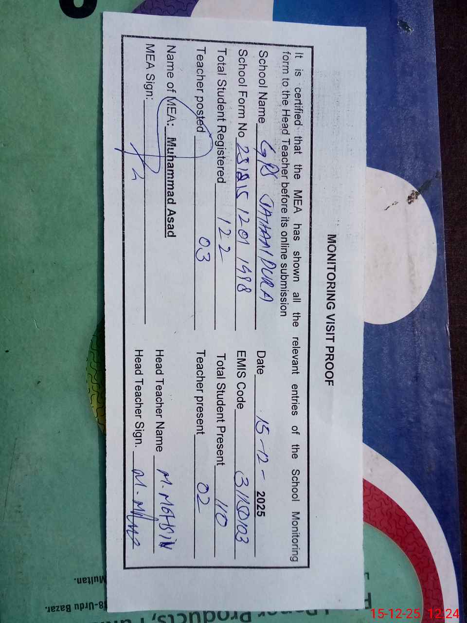 | EMIS Code: 31150103 | Name of School: GPS JAHAN PURA | |||