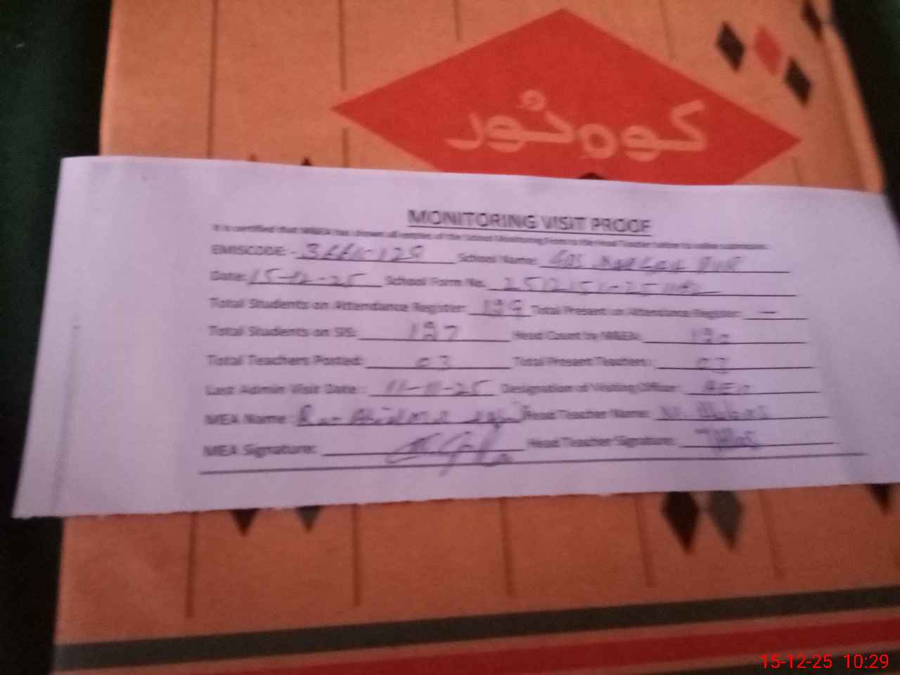 | Attendance Register | Head Teacher | MEA with School | Visit Proof |