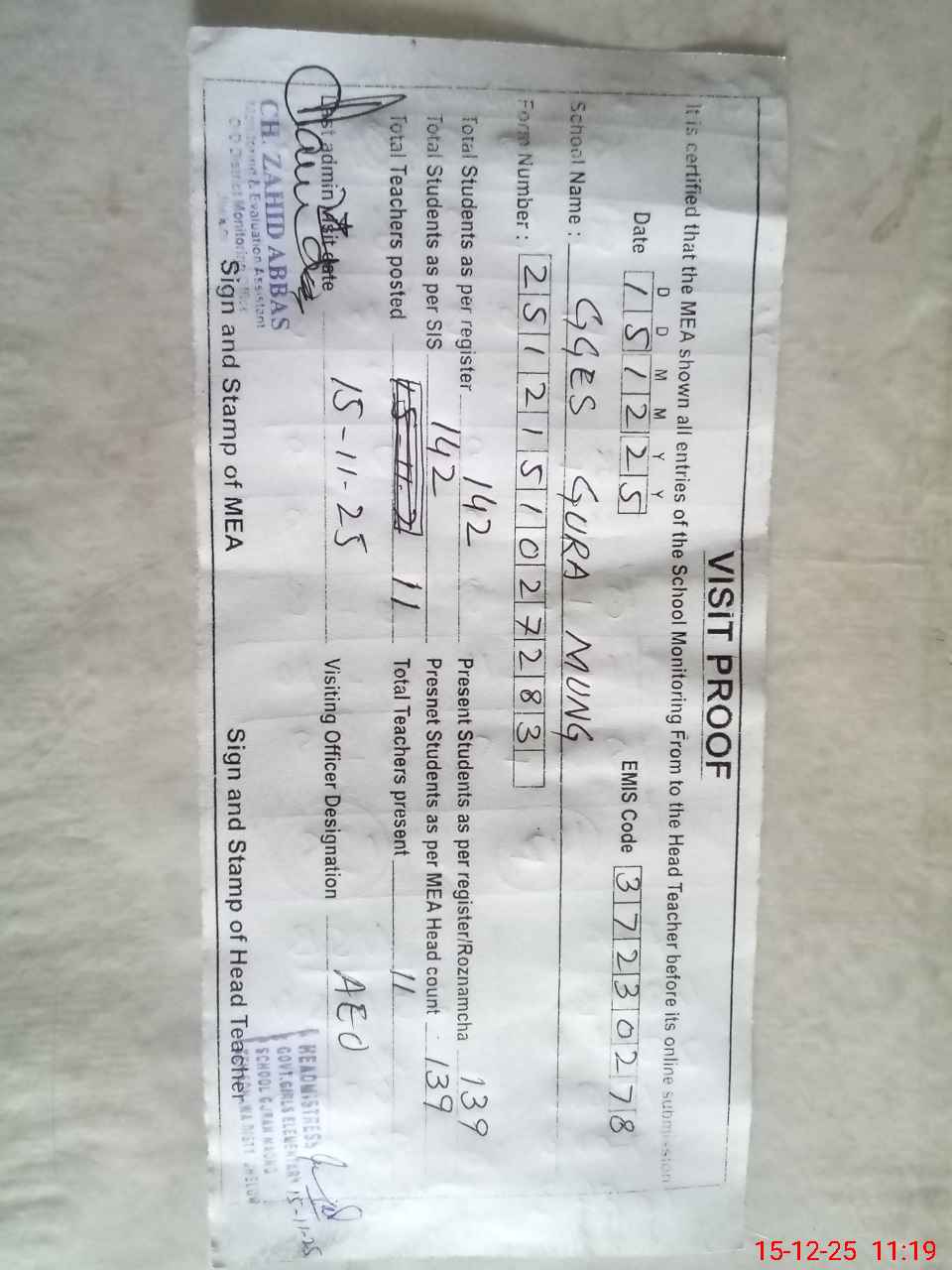 | Monitoring Date: 15-12-2025 | Start Time: 15-12-2025 10:27 AM | End Time: 15-12-2025 11:24 AM | Name of MEA: Za**** Ab**** | |