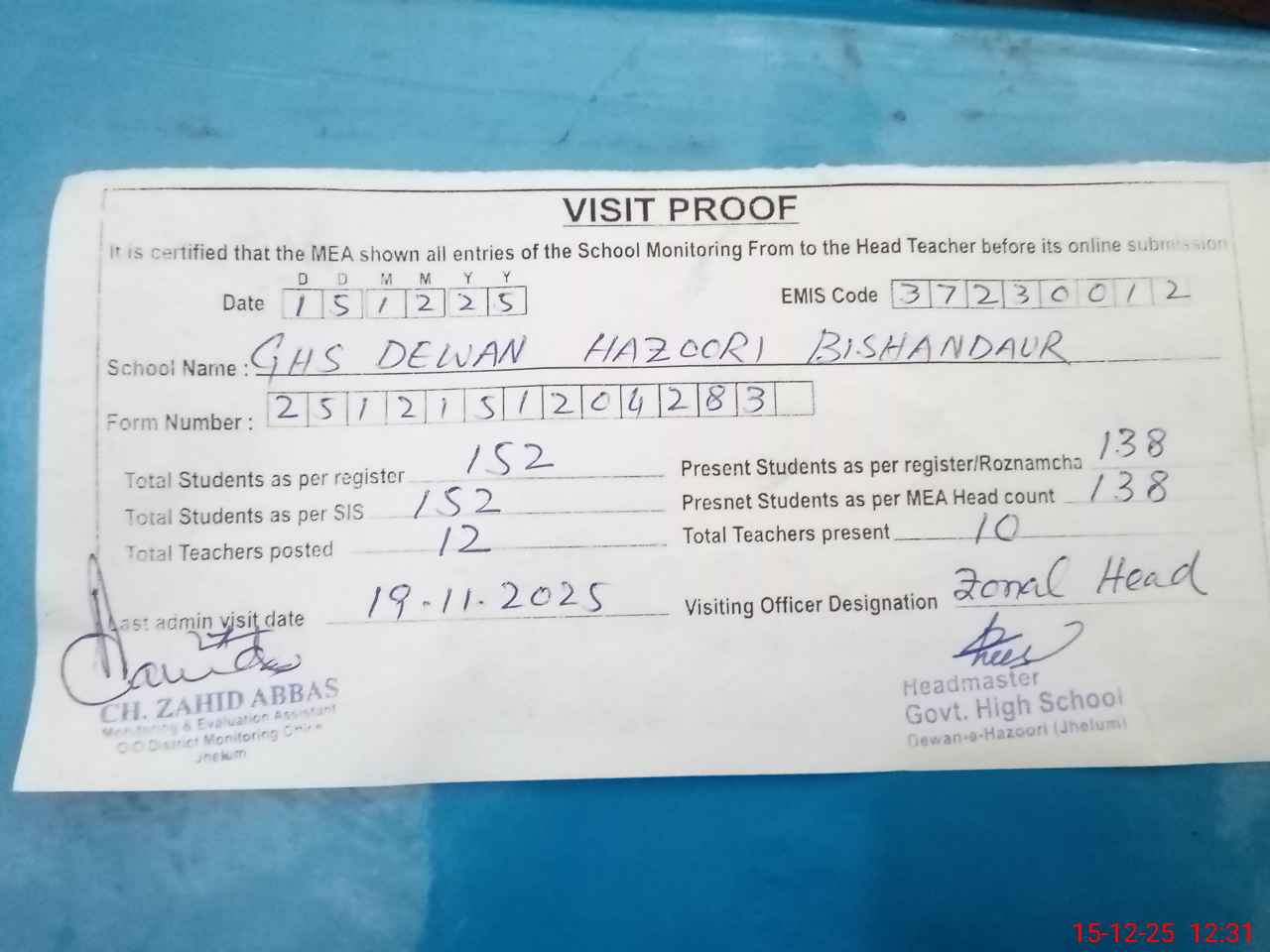 | Attendance Register | Head Teacher | MEA with School | Visit Proof |