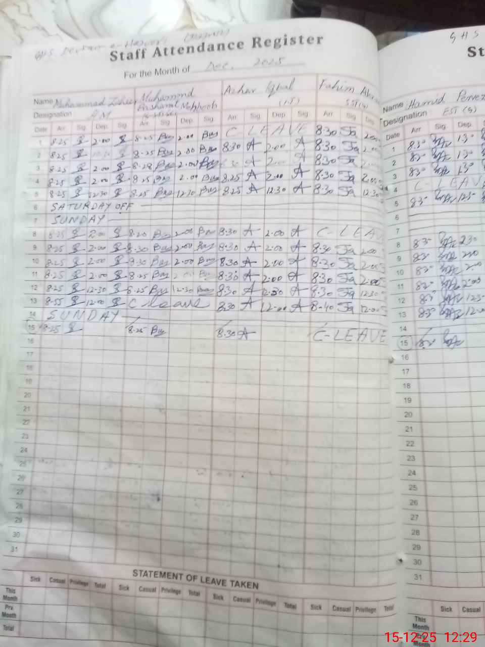 | CNIC | Full Name | Designation | R/C | Absence During Last Calender Month |