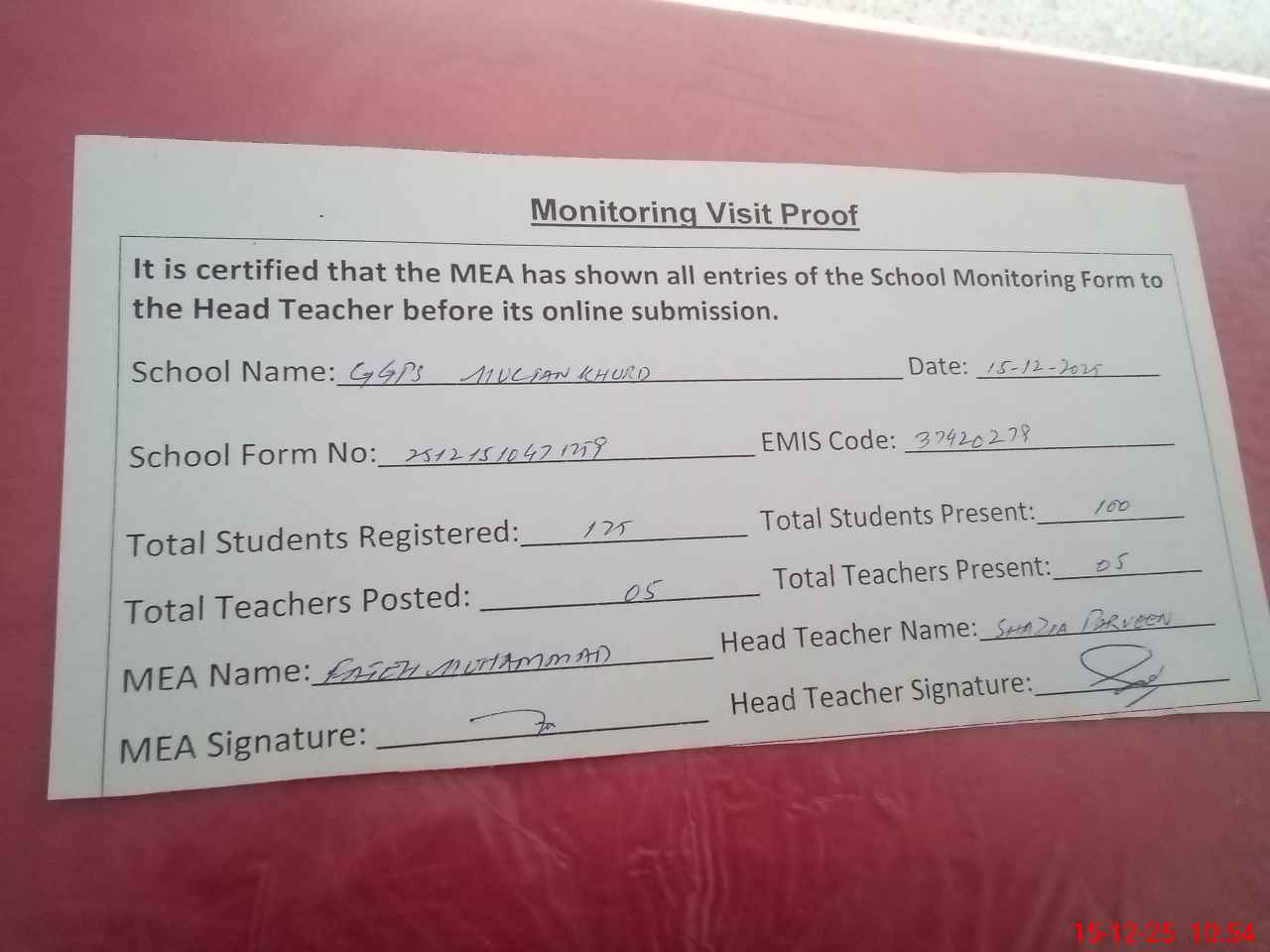 | Attendance Register | Head Teacher | MEA with School | Visit Proof |