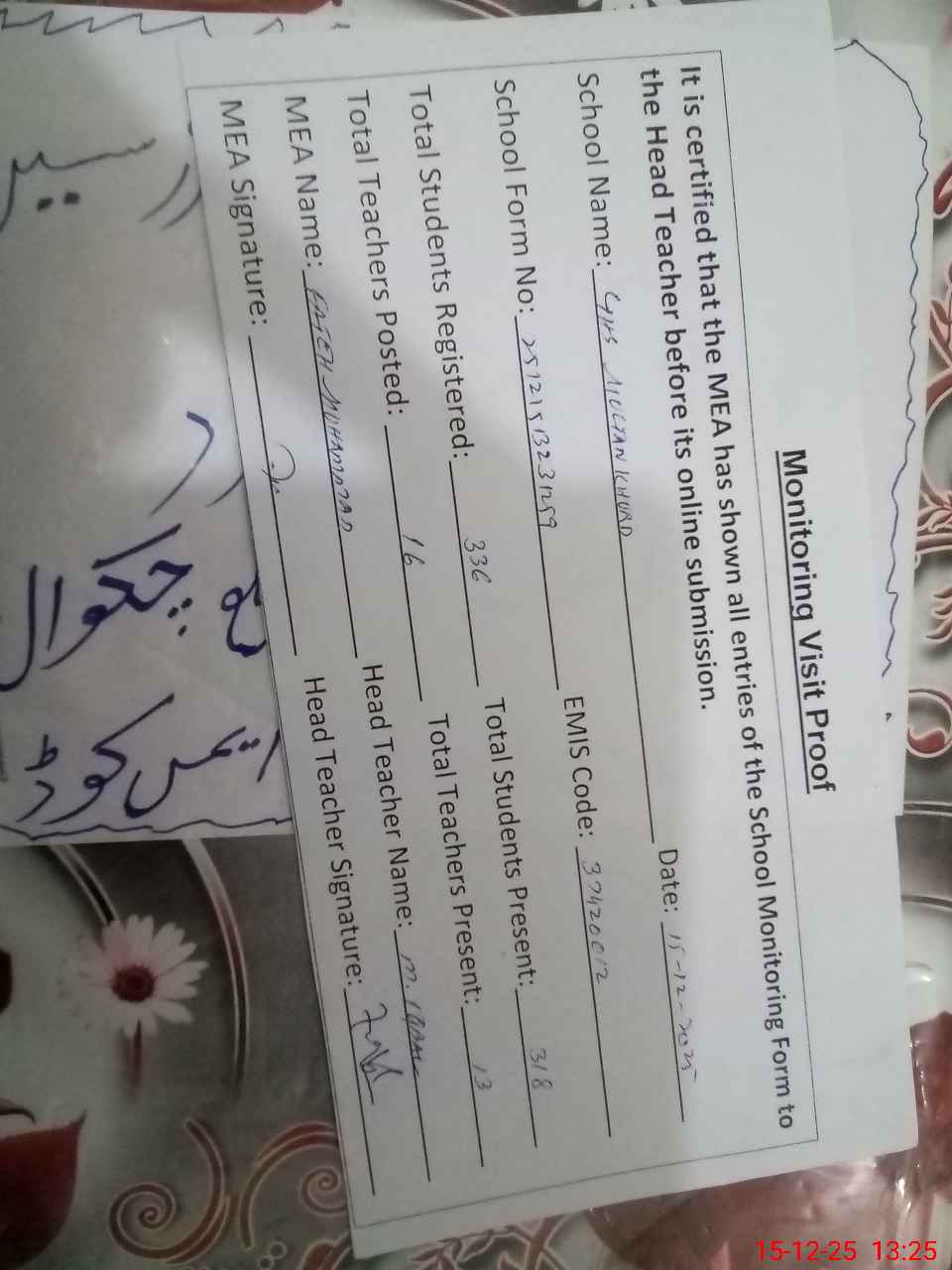 | Certified that this School was Inspected by the Undersigned MEA/DMO Today and the Information Stated Above is as Per Record. | |||||