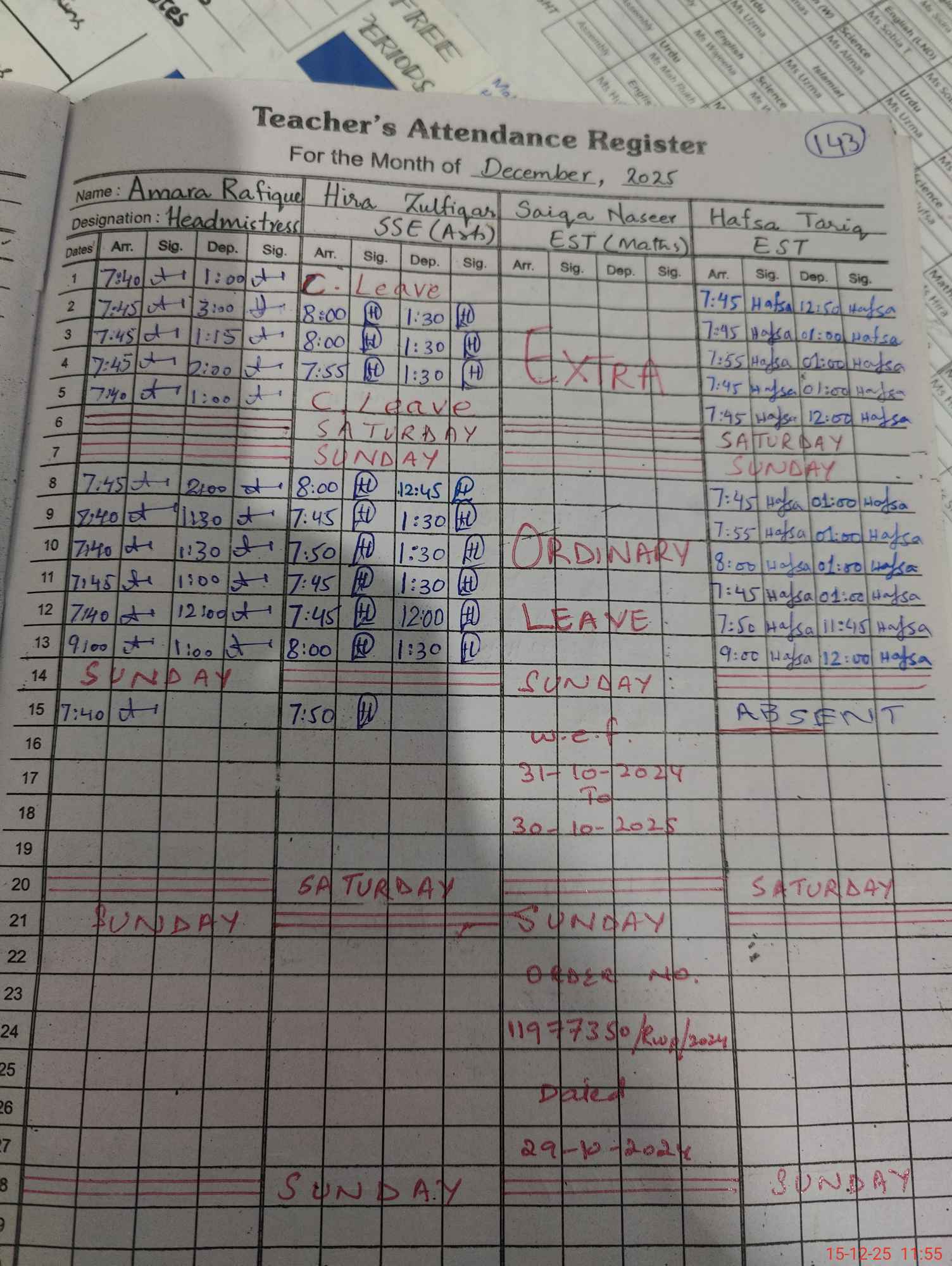 | Total no. of Classrooms: 8 No. of Classrooms Used for Teaching: 7 No. of Classrooms Storing Old Furniture, FTBs, etc: 0Comments if Any: Est hafsa tariq found unauthorized absent. According to head teacher statement above mentioned teacher applied for leave but head teacher didn't approved her leave and she refused to come |