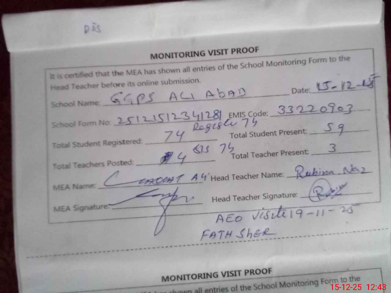 | Attendance Register | Head Teacher | MEA with School | Visit Proof |