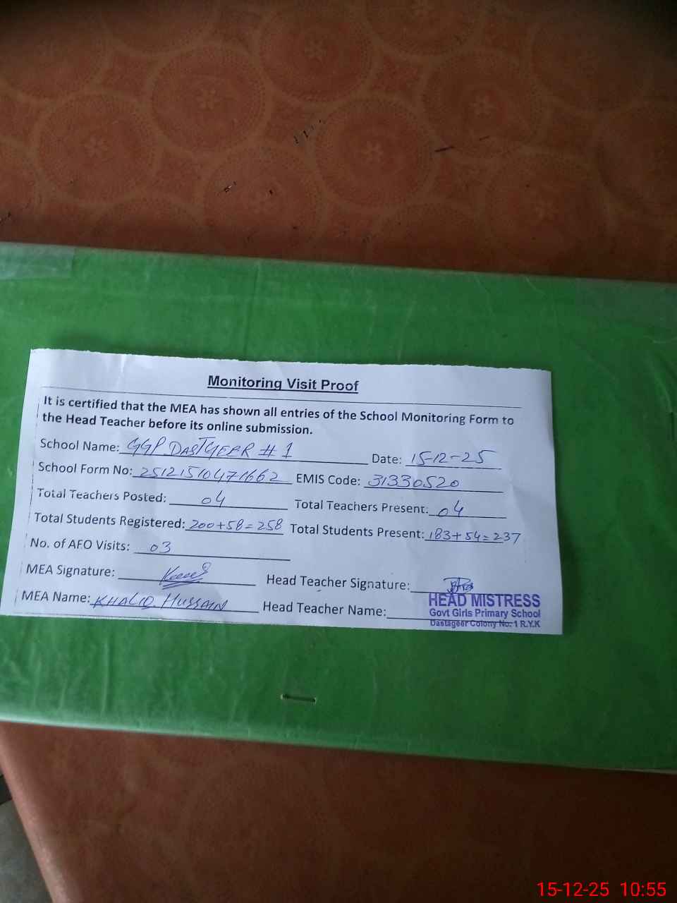 | Attendance Register | Head Teacher | MEA with School | Visit Proof |