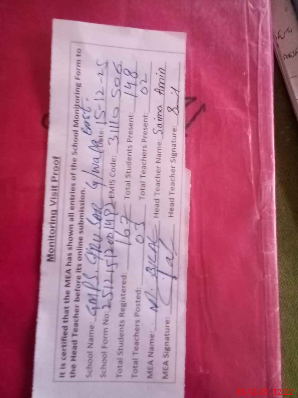 | Attendance Register | Head Teacher | MEA with School | Visit Proof |