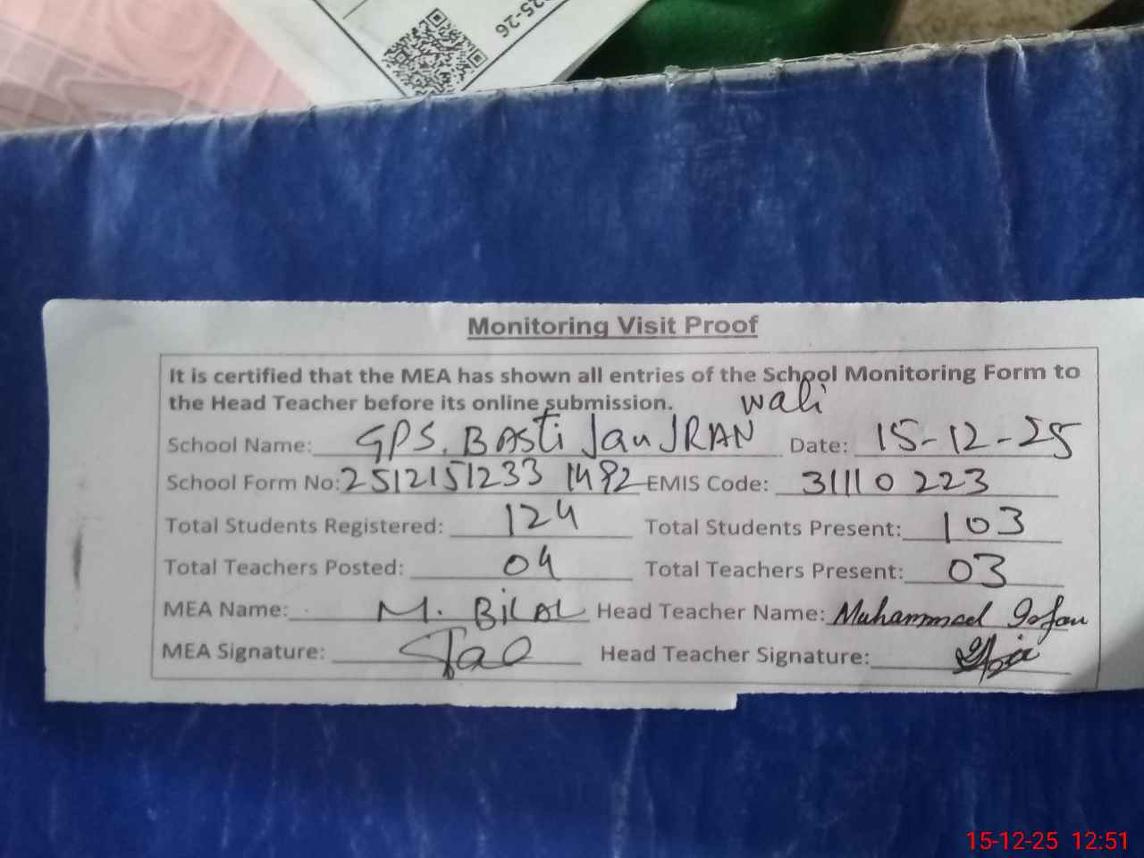 | Attendance Register | Head Teacher | MEA with School | Visit Proof |