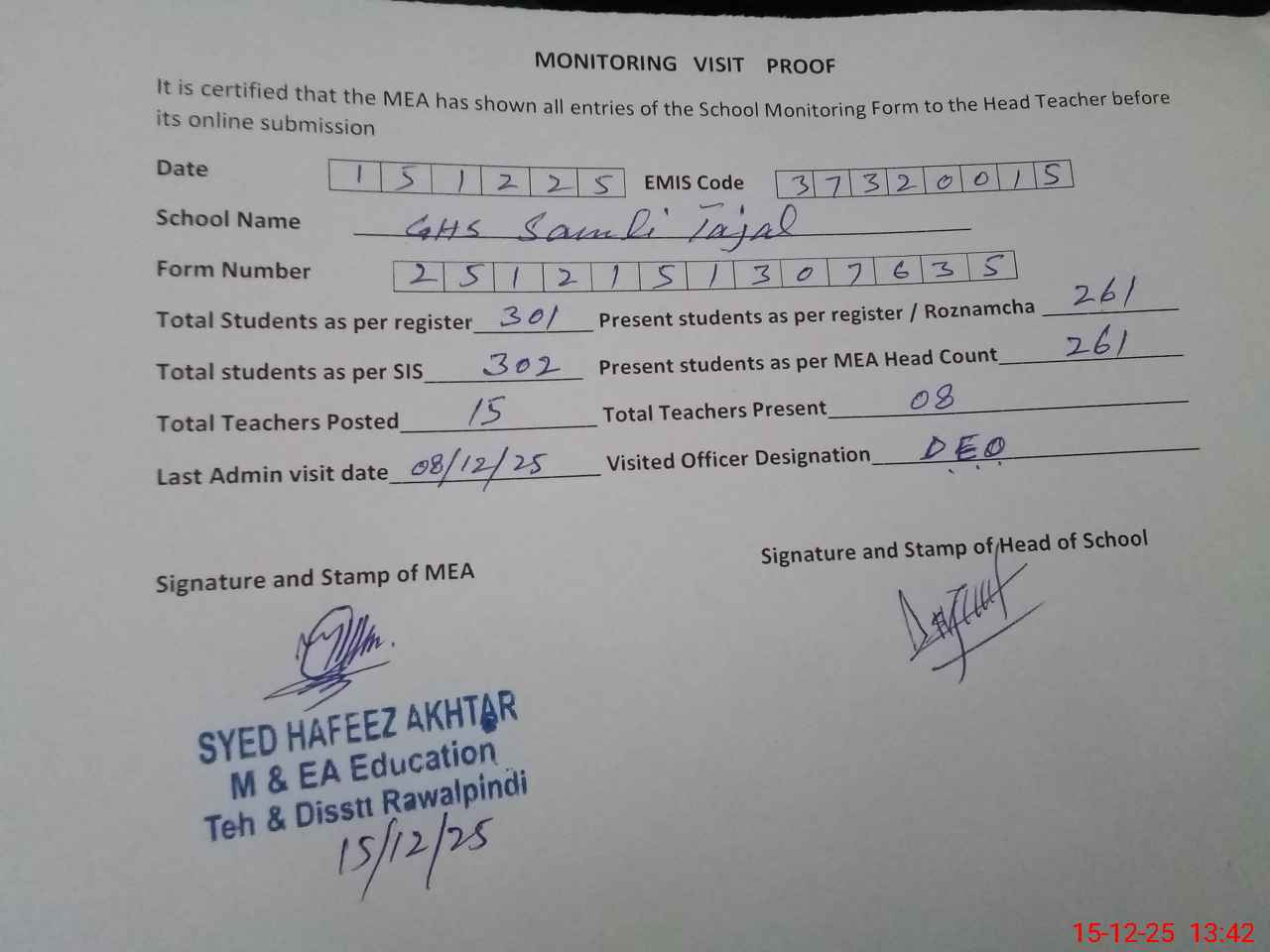 | Certified that this School was Inspected by the Undersigned MEA/DMO Today and the Information Stated Above is as Per Record. | |||||