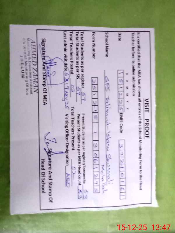 | EMIS Code: 37210161 | Name of School: GPS TALIM UL ISLAM SHUMALI MOHALLA | |||