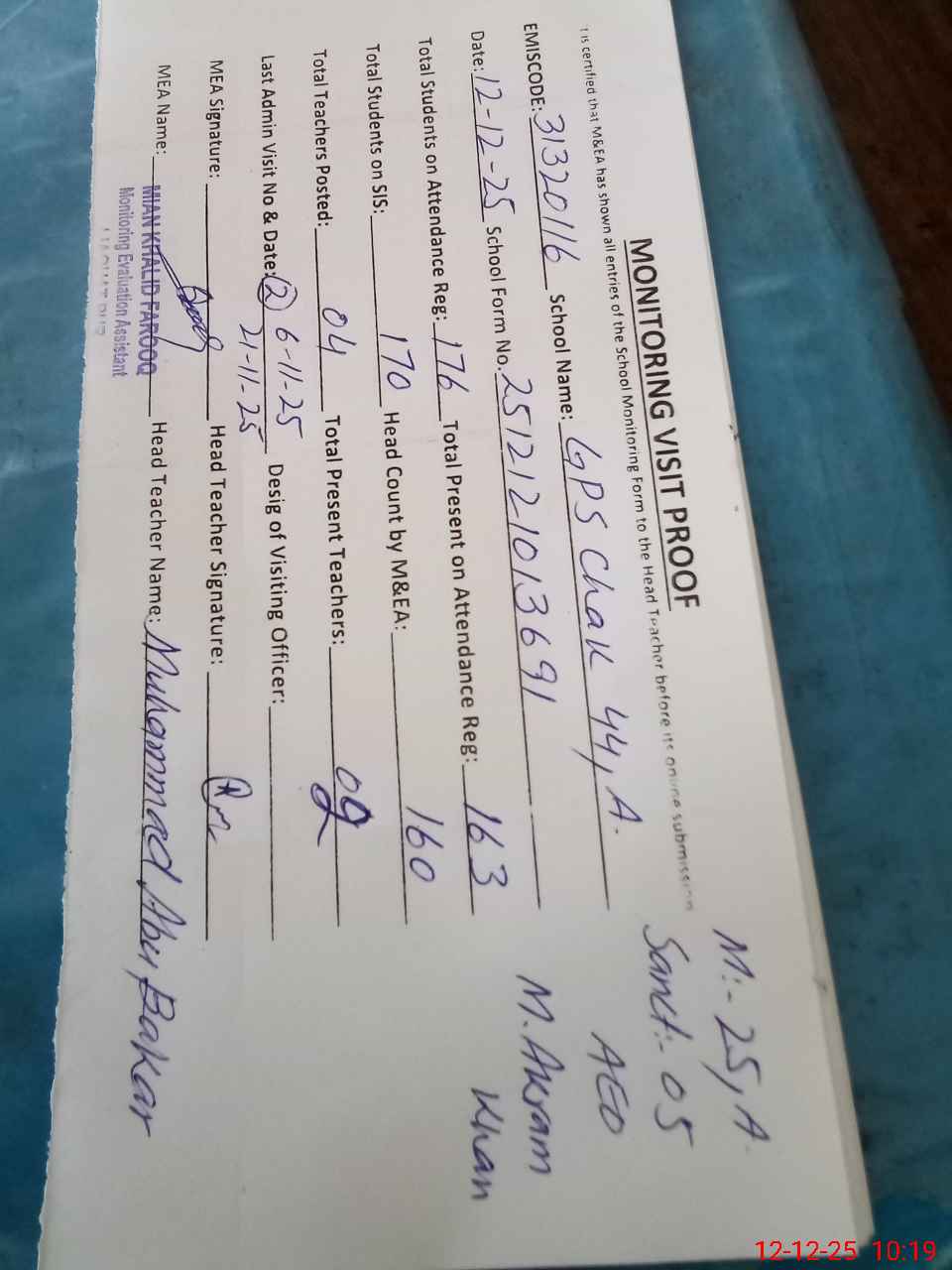| Monitoring Date: 12-12-2025 | Start Time: 12-12-2025 09:45 AM | End Time: 12-12-2025 10:20 AM | Name of MEA: Kh**** Fa**** | |