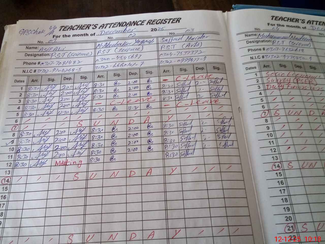 | CNIC | Full Name | Designation | R/C | Absence During Last Calender Month |