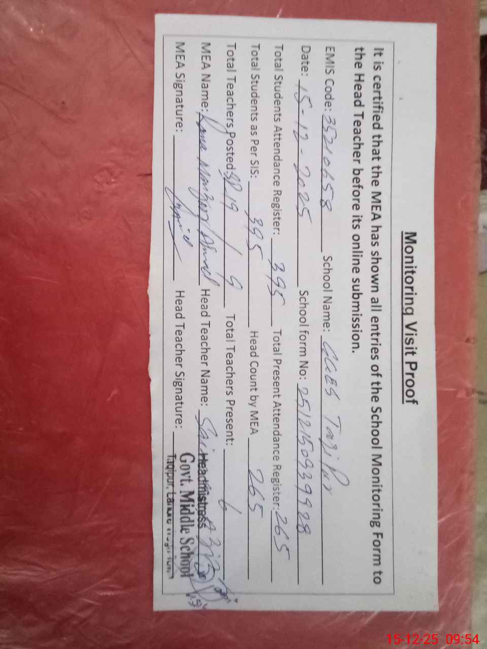| Attendance Register | Head Teacher | MEA with School | Visit Proof |