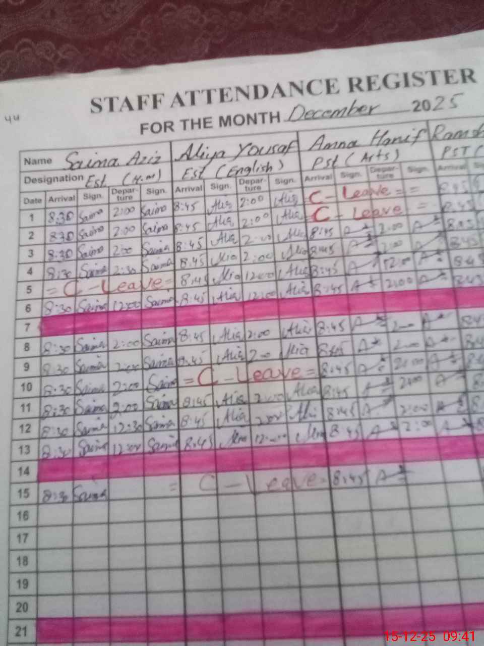 | CNIC | Full Name | Designation | R/C | Absence During Last Calender Month |