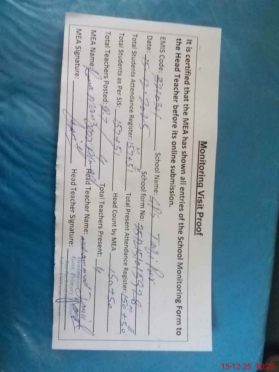 | Attendance Register | Head Teacher | MEA with School | Visit Proof |